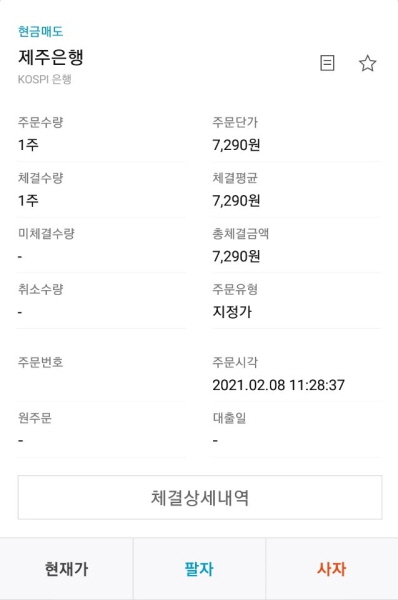2021년 2월 8일 11시 28분, 네이버 제주은행 인수설 때문에 요새 핫한 급등주로 등극한 코스피 006220 제주은행 주식 1주를 7290원에 잘 던지고 나왔어요.