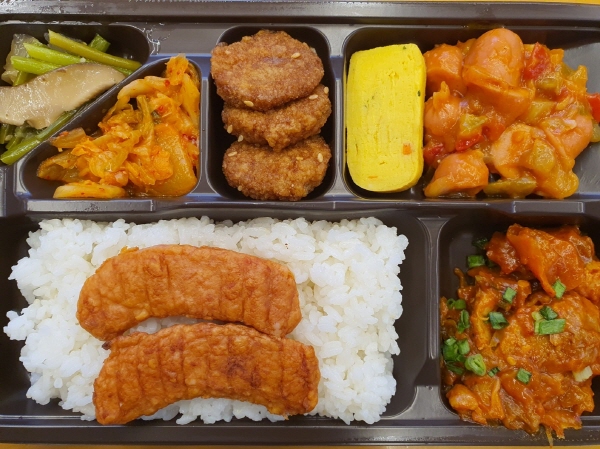 달걀말이는 다른 편의점 것과 아주 똑같은 맛이었어요. 소세지 볶음은 케첩 베이스 소스로 볶은 반찬이었어요. 이 역시 다른 편의점 도시락에 들어 있는 소세지 볶음과 같았어요.