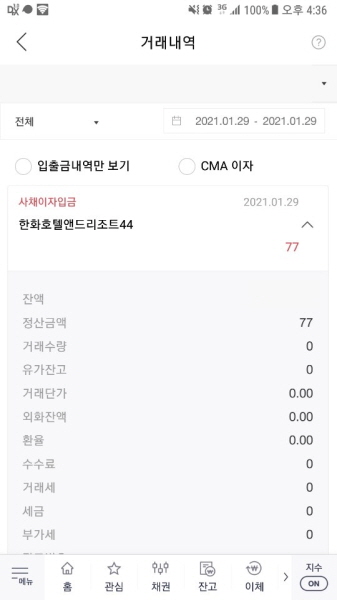 2021년 1월 29일, 한화호텔&리조트 채권 중 하나인 한화호텔앤드리조트44 회사채 확정금리 이표채 일반사채의 2021년 1월 사채 이자가 입금되었어요.