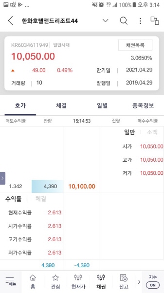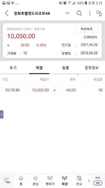 이름을 보면 한화그룹 것이기 때문에 괜찮아 보였어요. 그렇지만 이름에 대놓고 '호텔'이라는 단어와 '리조트'라는 단어가 들어가 있었어요. 이것 때문에 엄청나게 망설여졌어요. 아무리 봐도 호텔업, 리조트업은 단시간에 개선될 리가 없었어요. 아무리 주식보다 안전한 채권이라고 해도 회사가 망하면 돈 못 갚아요. 장내 채권 시장에 자주 등장하는 채권 중 하나인 파라다이스 회사채도 이 점 때문에 안 건드리고 있었어요. 파라다이스 회사채는 가격이 괜찮게 나와 있었지만 호텔업, 카지노업이 대체 언제 좋아질지 예측이 안 되었기 때문이었어요.