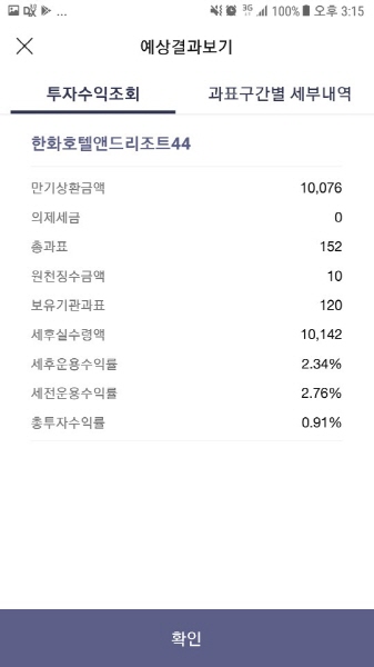 한국투자증권 뱅키스 어플 장내채권 투자체험으로 수익을 계산해봤어요. 세전운용수익률은 2.76%, 세후운용수익률은 2.34%라고 나왔어요. 총투자수익률은 0.91%라고 나왔어요.