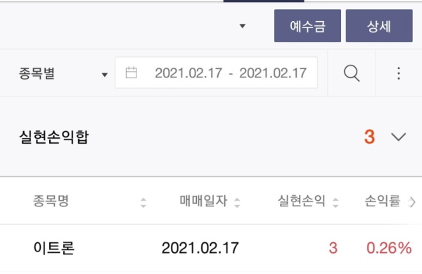 코스닥 096040 이트론 주식 1주를 1130원에 매수해서 1135원에 매도했어요. 매매차익은 5원이었어요. 이 중 무려 2원이나 증권거래세로 뜯겨서 실제 수입은 3원이었어요. 수익률은 불과 한 틱 5원만 먹고 바로 나왔지만 0.26%였어요. 3원이라도 벌은 게 어디에요. 하락장에서 돈 벌고 나왔기 때문에 그걸로 엄청나게 만족스러웠어요. 그냥 3원이 아니었어요. 하락장에서 3원 수익을 내었어요. 평균적으로 상당수가 마이너스 계좌 상태일 건데 저는 플러스 3원이었어요.