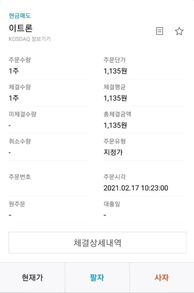 2021년 2월 17일 10시 23분, 러시아 백신 스푸트니크V 테마주 코스닥 096040 이트론 주식 1주를 1135원에 매도주문을 넣었어요.