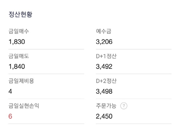 증권계좌에 원화 캐시 충전을 다시 하든가 RP 7일물 들어간 것을 매도해야만 돈이 생겼어요. 안 그러면 증권 계좌에 남아 있는 돈은 고작 3200원 남짓. 이걸로는 뭐 할 수 있는 게 없어요.