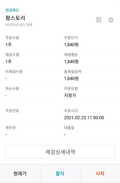 인플레이션 수혜주 코스닥 027710 팜스토리 주식 1주를 1840원에 매도 주문 넣었어요.