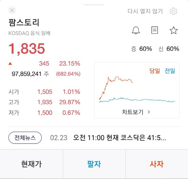 폭발적이고 파괴적인 폭등을 야기할 세력만 아는 호재? 만약 그런 게 있다면 현재 상황에서 테마가 워낙 짱짱한 거 여러 개 동시에 겹치니까 충분히 가능했어요. 그렇지만 그런 호재는 딱히 찾지 못했어요. 네이버 종토방을 비롯해 주식 관련 커뮤니티 모두 2021년 2월 23일에 코스닥 027710 팜스토리 주식이 상한가 언저리까지 폭등했다가 전일 대비 22% 넘는 가격인 1830원으로 끝났는지 이유를 모르고 있었어요.