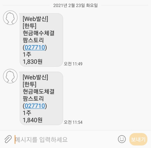 2021년 2월 23일 오전 11시 49분 3초, 코스닥 027710 팜스토리 주식 1주를 1830원에 매수주문 넣었어요. 다행히 체결되었어요.