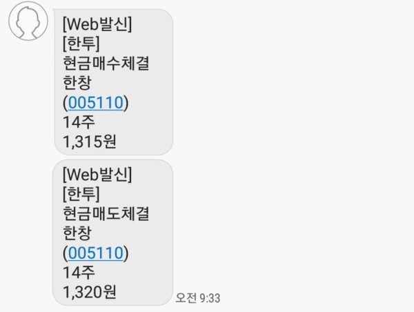 코스피 005110 한창 주식 1315원에 14주 매수 주문이 체결되자 곧바로 1320원에 전량 매도 주문을 넣었어요.