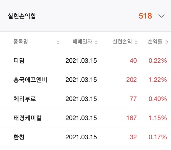 2021년 3월 15일, 파죽지세의 4연승이었어요. 거칠 것이 없었어요. 이제 고작 9시 27분이었어요. 한국 증시 개장한 지 딱 27분 지났어요. 그런데 그 27분에 태경케미컬, 흥국에프엔비, 체리부로, 디딤 주식에서 승리를 쟁취했어요. 들어가는 족족 순식간에 수익내고 잘 탈출했어요. 정말 되는 날이었어요. 급등주 목록에서 직감적으로 딱 찍어서 보면 들어갈 만한 주식이었고, 들어갈 타이밍도 바로바로 나왔어요. 27분에 단타 4번 치는 일이야 전에도 매우 많았어요. 하지만 보통 이런 경우는 한 종목 - 특히 지수 추종 ETF가 횡보하면서 잔파동을 계속 그리고 있을 때에 한정되어 있었어요. 이렇게 일반 종목 4종목을 골라서 연타로 4연승한 적은 그간 있었는지도 모르겠어요. 이렇게 매매가 잘 풀릴 수 있나 신기할 정도였어요.