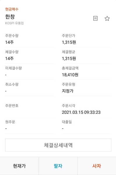 2021년 3월 15일 9시 33분, 화재 안전 테마주 코스피 005110 한창 주식을 1315원에 14주 매수 주문 넣었어요. 총체결금액은 18410원이었어요. 이것도 증권계좌에 있는 돈으로 한 번에 다 집어넣었어요. 기세가 오르는 기세였어요. 1315원에 있는 매물이 거의 다 잡아먹히고 있었어요. 그래서 매도 물량을 바로 잡았어요.