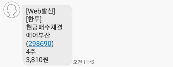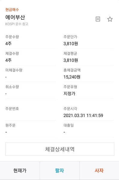 2021년 3월 31일 11시 41분 59초, 코스피 298690 에어부산 주식을 3810원에 4주 매수했어요.