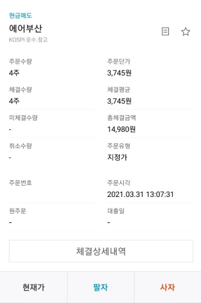 2021년 3월 31일 오후 1시 7분, 저가항공 LCC 관련주 코스피 298690 에어부산 주식 보유 수량 전량을 3745원에 매도 주문 넣었어요.