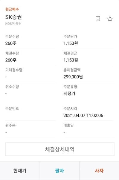 2021년 4월 7일 오전 11시 2분, 코스피 001510 SK증권 주식을 1150원에 260주 매수 주문을 넣었어요. 제 차례가 오기를 기다렸어요. 11시 4분에 드디어 제 주문이 체결되었어요.