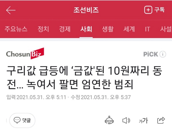 기사를 쭉 읽었어요. 역시나 제목 보고 예상했던 내용이었어요. 국제 구리 가격이 급등하자 10원 동전 주화훼손 범죄 우려가 커지고 있다는 내용이었어요.