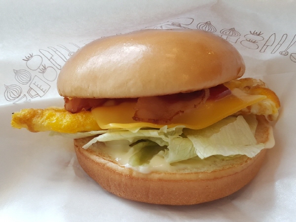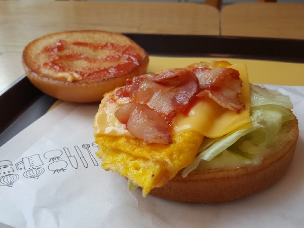 베이컨도 마찬가지였어요. 베이컨을 먹으면 베이컨 맛이 나기는 하지만 그렇게 엄청 큰 소리 내는 맛은 아니었어요. 치즈처럼 완전 밑바닥 깔아주는 정도까지는 아니었어요. 그래도 베이컨이라 자기 맛과 향이 확실히 있었어요. 그러나 확실히 계란 오믈렛, 햄버거 번과 조화를 이루고 있었어요. 절제된 베이컨의 맛이었어요.