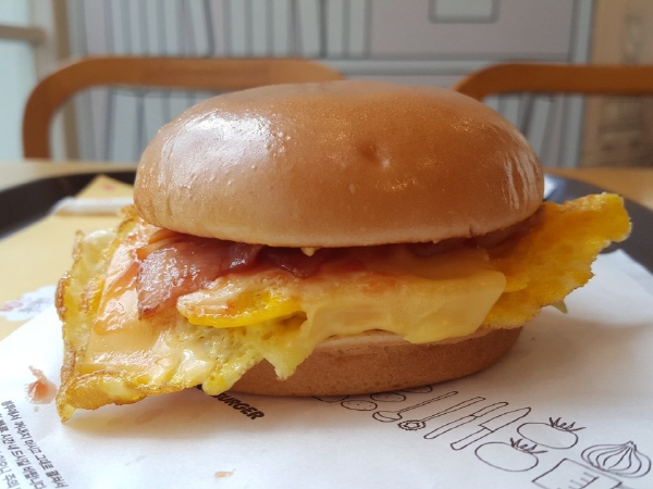 모스버거 베이컨 치즈 오믈렛 햄버거는 매장이 희귀한 모스버거, 그 모스버거에서도 하필 몇몇 매장에서만 아침 10시 반까지만 판매하는 메뉴라 많이 못 알려진 매우 맛있는 햄버거였어요.