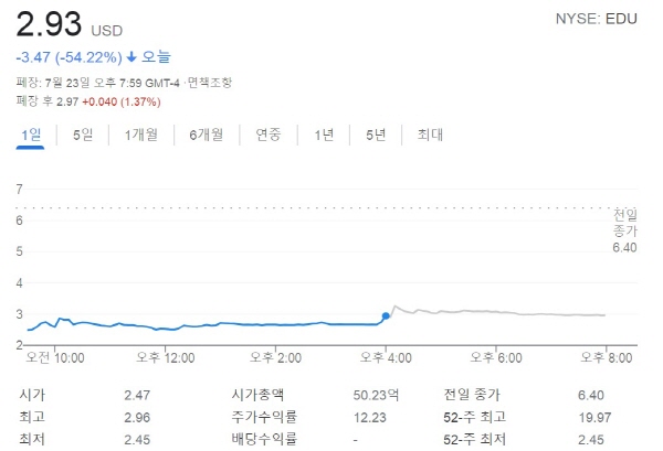 중국 당국은 이 내용에 대해 공식 답변은 하지 않았다고 해요. 하지만 시장에서는 이를 사실상 기정 사실로 받아들이고 있는 모양이었어요. 그러니 미국 증시 상장 중국 교육주가 일제히 대거 폭락했죠.