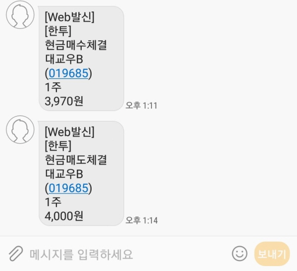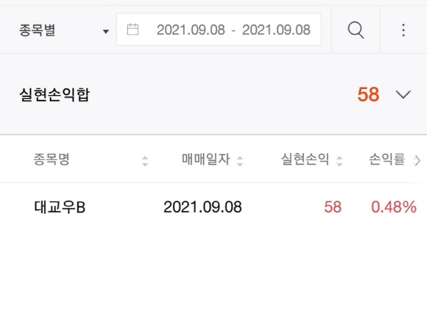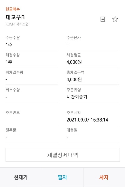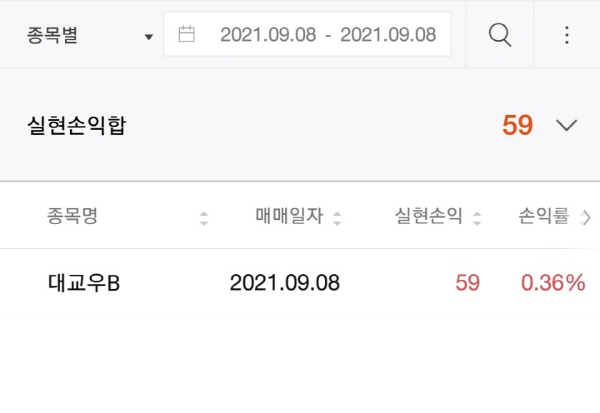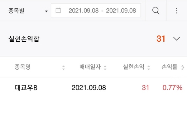 코스피 019685 대교우B 주식을 9월 7일에 장후 시간외 종가거래에서 4천원에 매수한 후 다음날인 9월 8일에 4040원에 매도했어요. 증권거래세 제하고 나자 31원 벌었어요.