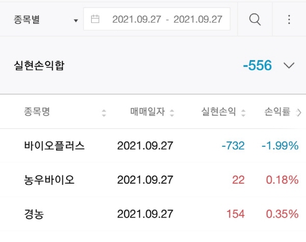 2021년 9월 27일, 한국 주식 신규상장주 코스닥 099430 바이오플러스 주식 매매로 732원 잃었어요. 경농과 농우바이오로 번 돈 다 날리고 추가로 게임비까지 내야 했어요.