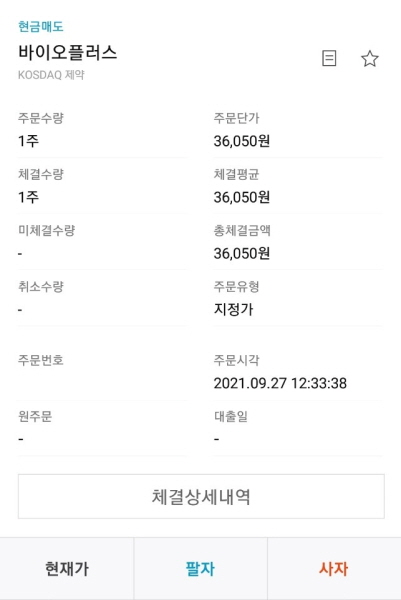 2021년 9월 27일 12시 33분, 코스닥 099430 바이오플러스 주식 보유 수량 전량을 36050원에 던져버렸어요.