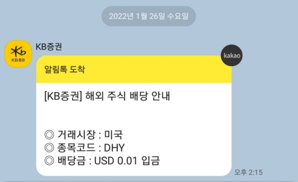 미국 하이일드 채권 ETF DHY의 2022년 1월 분배금이 입금되었어요. 1센트였어요. 이것도 돈을 벌어오고 있었어요.