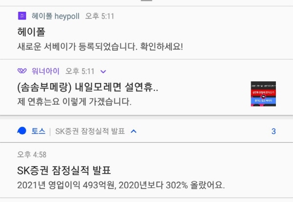 토스증권에서 알람이 울렸어요. SK증권 잠정실적이 발표되었다는 내용이었어요. 2021 영업이익이 493억으로, 2020년보다 302% 상승했다고 했어요. 그래봐야 주가가 오를 리 없었어요. 왜냐하면 한국 주식이니까요.