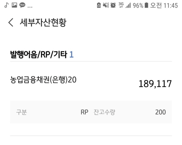 어떤 채권이 RP 종목으로 매수되었는지 봤어요. 농업금융채권(은행)20 채권이었어요.