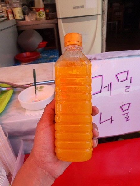 구인당식당에서 500mL 패트병에 담긴 호박식혜를 판매하고 있었어요. 호박식혜는 고성군과 속초시 음식으로 알고 있는데 주문진에서 보니 신기했어요.