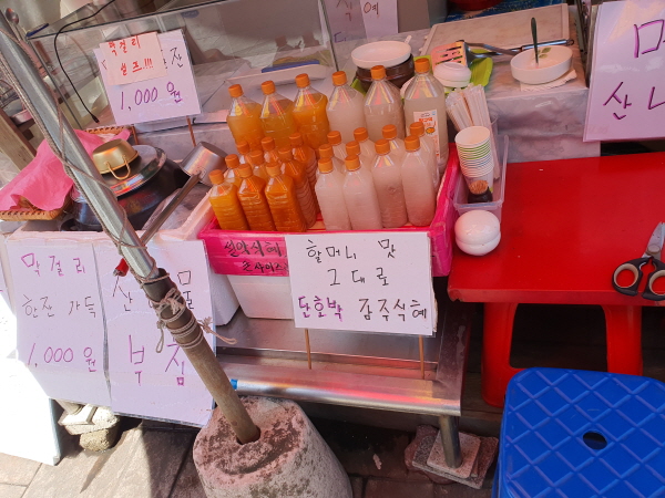 주문진 여행 가서 주문진 종합시장 구경할 때 구인당식당에서 호박식혜 한 통 사서 마시며 다니는 것도 좋아요.