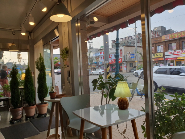 동명커피는 속초시외버스터미널 바로 옆에 있기 때문에 창밖 풍경은 속초시외버스터미널 맞은편 풍경이었어요. 저녁에 돌아가기 전에 앉아서 본 창밖 풍경은 나름 운치가 있었어요.
