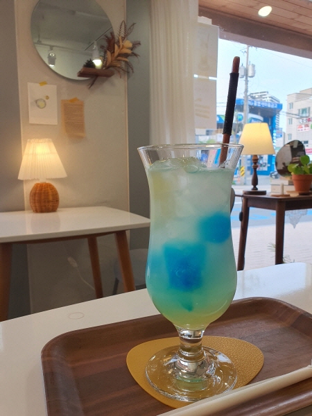 동명에이드는 레몬에이드였어요. 동명에이드 색깔은 파란색이었어요. 파란색 음료에 노랑색과 초록색이 어우러진 빛이었어요. 음료 색이 매우 예뻤어요.
