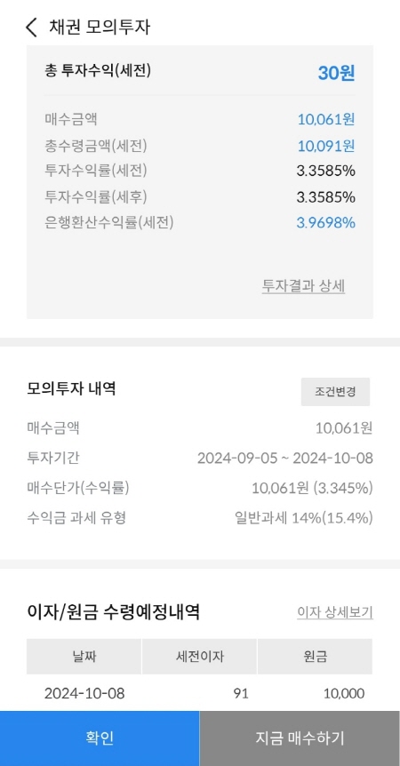 한국장학재단 21-11(사)을 10매 매수하면 매수 금액은 10,061원이었어요. 만기에 받는 원리금은 10,091원이었어요. 세전 투자수익률은 3.3585%, 세후 투자수익률은 3.3585%, 세전 은행환산수익률은 3.9698%라고 나왔어요.
