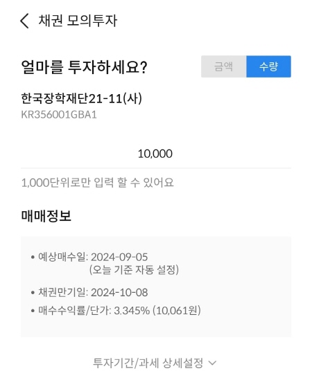 삼성증권에서 판매하는 한국장학재단 21-11(사)를 10매 매수하면 총 투자수익은 30원이었어요. 10매 보다 더 많이 매수하면 세금이 커져서 투자수익이 줄어들 거에요.