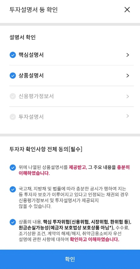 한국장학재단 21-11(사)는 특수채에요. 그래서 신용평가정보서, 투자설명서 체크가 아예 막혀 있었어요. 이 둘을 체크하지 않고 매수하도록 되어 있었어요.