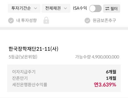 한국장학재단 채권은 처음 봤어요. 삼성증권에서는 세전은행환산수익률 연3.639%에 판매하고 있었어요.
