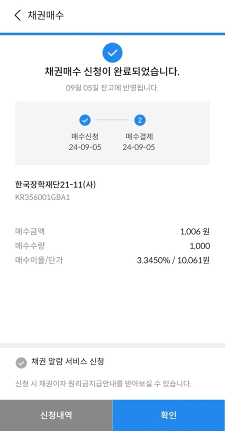 한국장학재단 21-11(사) 채권을 1매 매수했어요. 가격은 1,006원이었어요.