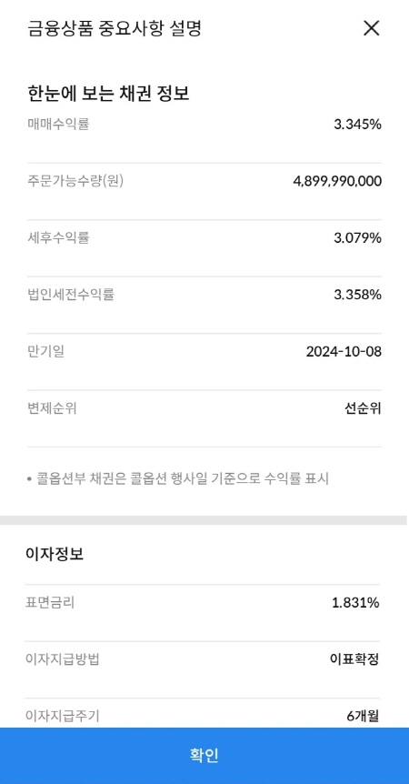 삼성증권은 한국장학재단 21-11(사) 채권을 매매수익률 3.345%에 판매중이었어요. 세후 수익률은 3.079%였어요.
