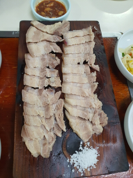 위 사진은 돔베고기에요. 돔베고기는 제주도식 수육이에요. 돔베고기도 잡내가 없었고, 고소하고 맛있었어요. 돔베고기는 매우 부드러웠어요. 수육 좋아하는 사람이라면 매우 좋아할 맛이었어요. 이건 타지역 사람들에게 진입장벽이 아예 없는 맛이었어요. 호근동은 몸국도 유명하지만, 돔베고기가 대표메뉴라고 해요.