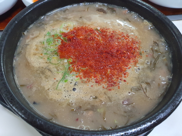 몸국 대신에 관광객들에게 널리 알려진 것이 바로 제주도 제주시 서사로에 있는 우진해장국 고사리 해장국이에요. 둘 다 기본은 같은데 몸국은 해초인 모자반이 들어가고, 고사리 해장국은 고사리가 들어가요. 진한 고깃국물에 메밀가루를 풀어서 걸쭉하게 만들고, 이렇게 걸쭉해진 국물에 모자반을 넣으면 몸국이고, 고사리를 넣으면 고사리 해장국이에요.