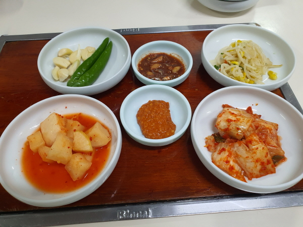 밑반찬은 배추김치, 깍두기, 콩나물무침, 풋고추, 생마늘과 쌈장, 그리고 멸치젓이 나왔어요.