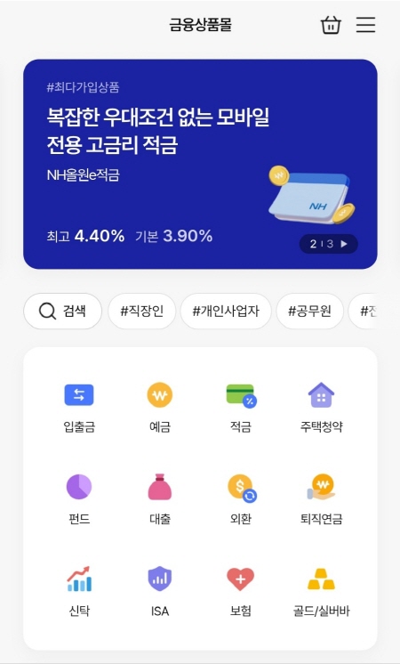 먼저 NH농협은행 어플로 들어가서 금융상품몰로 들어갔어요. 맨 위에 NH농협은행의 자유적금인 NH올원e적금 홍보 배너가 있었어요. 홍보 배너에 떠 있는 NH올인e적금으로 들어가도 되고, 하단에 있는 '적금'을 터치해서 찾아서 들어가도 되요.