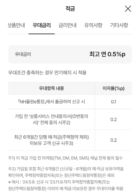 NH농협은행의 자유적금인 NH올원e적금의 우대금리는 최고 0.5%p를 받을 수 있어요.