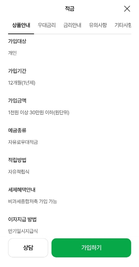 가입기간은 오직 12개월 뿐이었어요. 24개월도 있었으면 좋았겠지만, 무조건 12개월이었어요. 왜냐하면 이 상품은 사실상 미끼 상품 같은 존재이기 때문이에요.