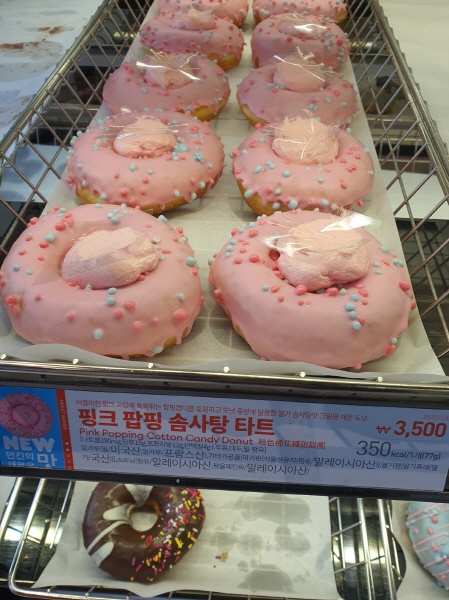 던킨 핑크 팝핑 솜사탕 타트 도넛은 팝핑캔디가 경쾌하고 신나는 봄날의 판타지를 만들고 있는 도넛이었어요. 하지만 100원 더 받더라도 팝핑캔디를 훨씬 더 많이 붙여줬다면 좋았을 거라는 아쉬움이 남는 도넛이었어요.
