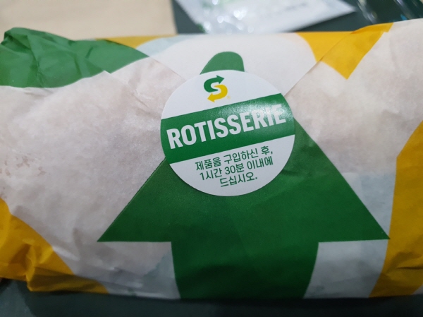 써브웨이 썹픽 로티세리 바비큐 치킨 샌드위치는 포장지 끝에 'ROTISSERIE'라고 인쇄되어 있는 스티커가 붙어 있어요. 써브웨이는 이 스티커로 샌드위치를 구분해요.