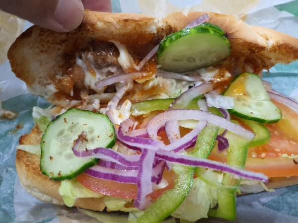 써브웨이 썹픽 로티세리 바비큐 치킨 샌드위치는 이렇게 생겼어요.