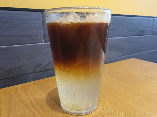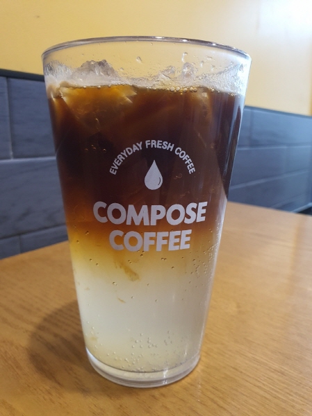 컴포즈커피 레몬 사샷추 커피는 광고 사진과 똑같이 생겼어요. 아래에는 레몬즙이 들어간 탄산이 두껍게 층을 이루고 있었고, 위에는 커피가 층을 이루고 있었어요. 2층으로 나뉘어 있었어요.