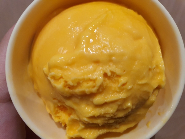 아무리 봐도 귤색이었어요. 멜론은 머스크 멜론이 워낙 친숙하고, 메로나의 영향도 있어서 연초록색이 원래 멜론 과육 색깔 같아요. 칸탈로프 멜론 과육 색이지만, 아무 것도 모르고 보면 영락없는 귤 아이스크림 색깔이었어요.
