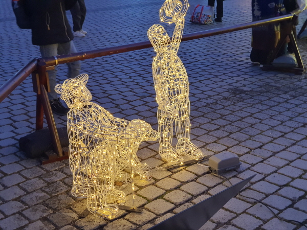 구유 조형물 대각선 앞에는 조명으로 만든 사람 두 명과 개 한 마리가 있었어요.