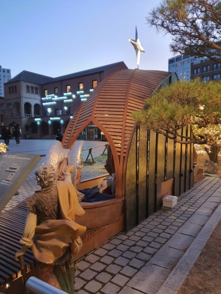 매해 크리스마스 시즌이 되면 명동성당에서는 명동성당 본당 앞에 구유 조형물을 설치해요. 12월이 되었으니 명동성당 본당 앞에 구유 조형물을 아마 설치해놨을 거였어요.
